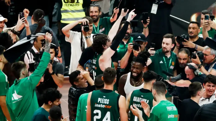 Με τη λήξη της αναμέτρησης, οι παίκτες και οι οπαδοί του Παναθηναϊκού έγιναν… ένα για να πανηγυρίσουν έξαλλα τη νέα μεγάλη επιτυχία της ομάδας τους, που θα πάει στο Άμπου Ντάμπι για το back to back στη Euroleague.
