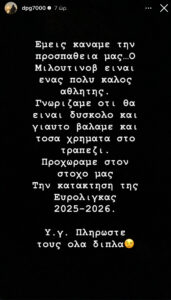 «Εμείς κάναμε την προσπάθειά μας… Ο Μιλουτίνοφ είναι ένας πολύ καλός αθλητής. Γνωρίζαμε ότι θα είναι δύσκολο και για αυτό βάλαμε και τόσα χρήματα στο τραπέζι. Προχωράμε στον στόχο μας. Την κατάκτηση της Ευρωλίγκας 2025-26.