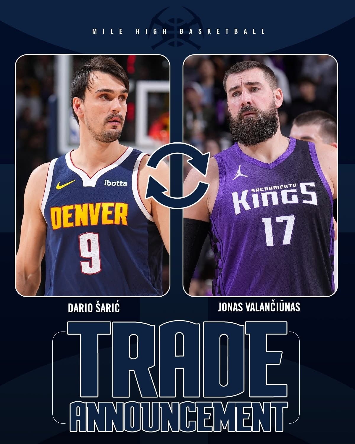 Στην επισημοποίηση της ανταλλαγής ανάμεσα σε Γιόνας Βαλαντσιούνας και Ντάριο Σάριτς προχώρησαν το βράδυ της Κυριακής (13/7) οι Ντένβερ Νάγκετς.