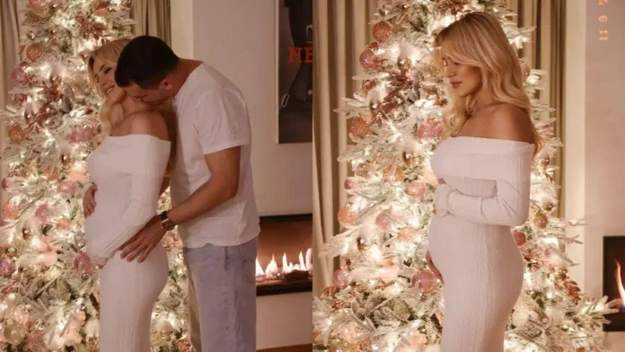Συγκεκριμένα, η παρουσιάστρια ανέβασε στο προφίλ 3 φωτογραφίες όπου τη βλέπουμε να ποζάρει με τον εκλεκτό της καρδιάς της, Παναγιώτη Κουτσουμπή, μπροστά από το χριστουγεννιάτικο δέντρο, χαϊδεύοντας τη φουσκωμένη της κοιλιά.