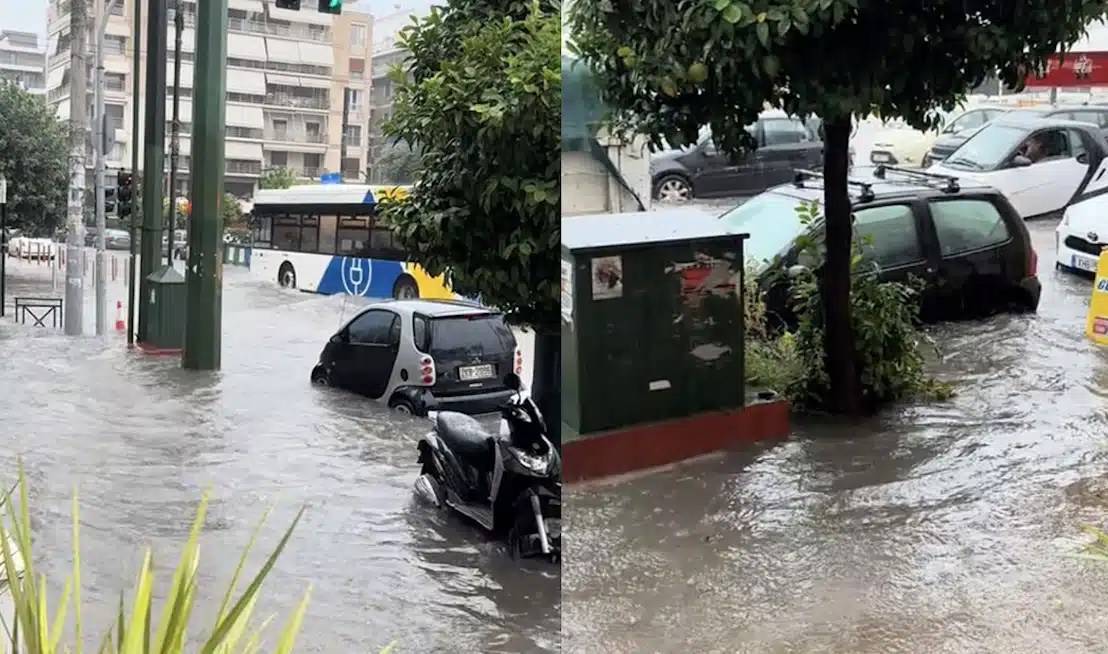 Μέσα σε λίγα μόλις λεπτά, οι δρόμοι γύρω από το κέντρο του Πασαλιμανιού, λίγα μόλις μέτρα από το λιμάνι, πλημμύρισαν, με τα νερά να φτάνουν μέχρι τα πεζοδρόμια και τα αυτοκίνητα να ακινητοποιούνται.