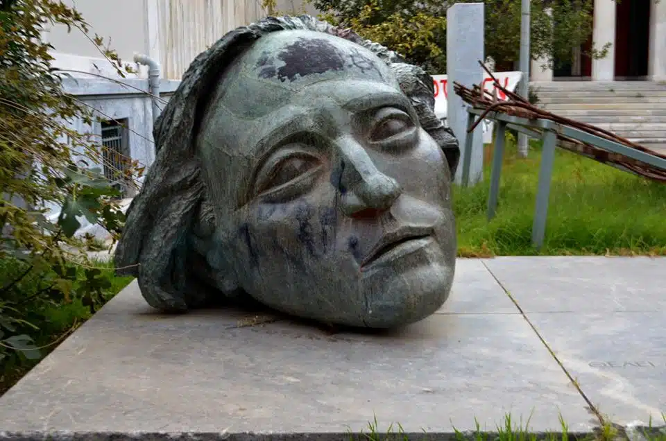Λουλούδια, στεφάνια και παιδικές ζωγραφιές καλύπτουν κάθε χρόνο μια κεφαλή – μνημείο για την επέτειο της εξέγερσης του Πολυτεχνείου. Το μεγάλο γλυπτό που βρίσκεται στον προαύλιο χώρο του παλιού κτιρίου Εθνικού Μετσόβιου Πολυτεχνείου είναι το σύμβολο στο οποίο όλοι αποτίουν φόρο τιμής στους αγωνιστές.