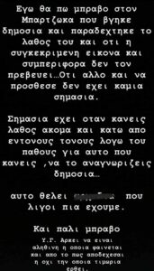 Εγώ θα πω μπράβο στον Μπαρτζώκα που βγήκε δημόσια και παραδέχτηκε το λάθος του και ότι η συγκεκριμένη εικόνα και συμπεριφορά δεν τον πρεσβεύει… Ό,τι άλλο και να πρόσθεσε δεν έχει καμία σημασία.
