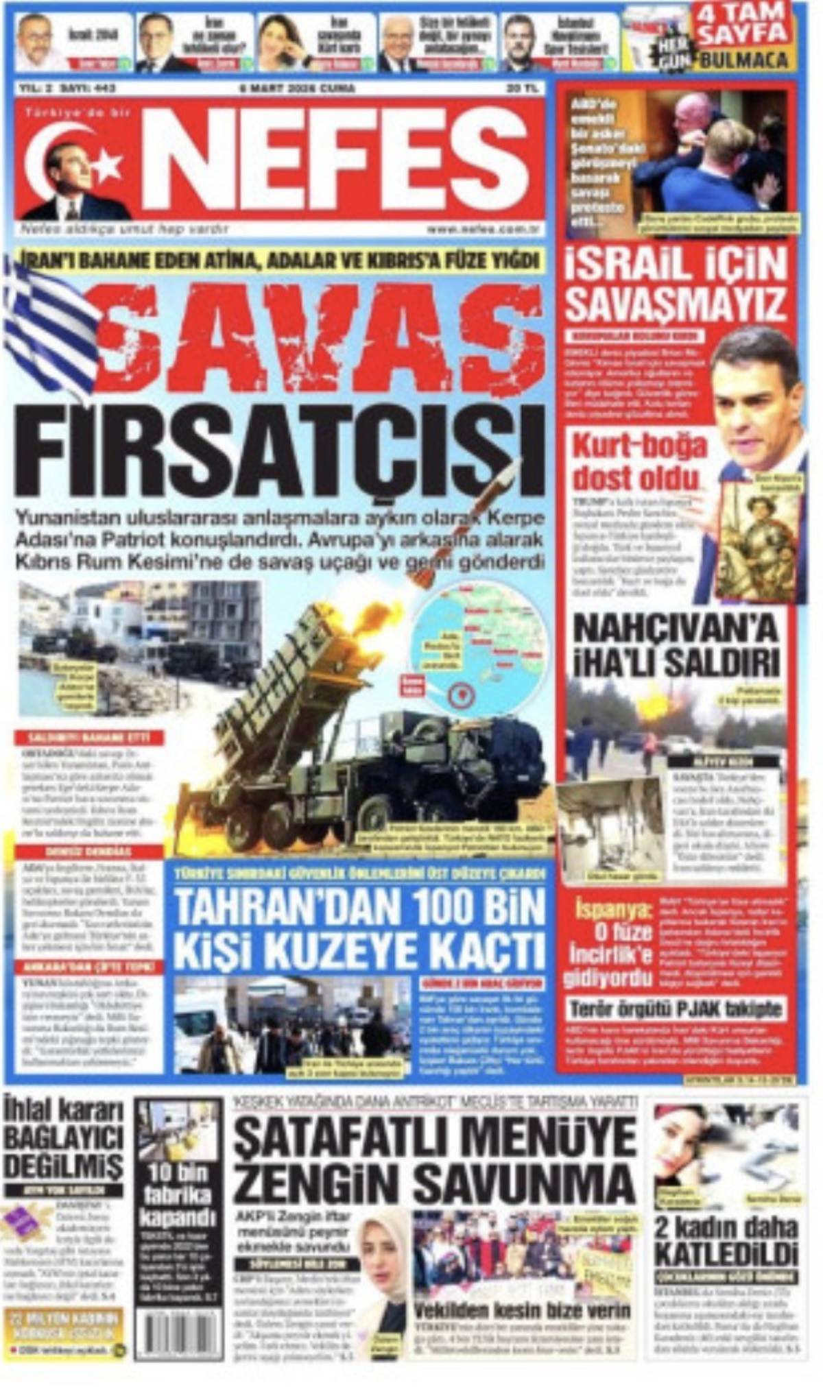 Η εφημερίδα, στο πρωτοσέλιδό της, προειδοποιεί: «Μην παίζεις με την φωτιά Νίκο», αποτυπώνοντας ξεκάθαρα την έντονη ενόχληση της Άγκυρας από τις τελευταίες ελληνικές πρωτοβουλίες.
