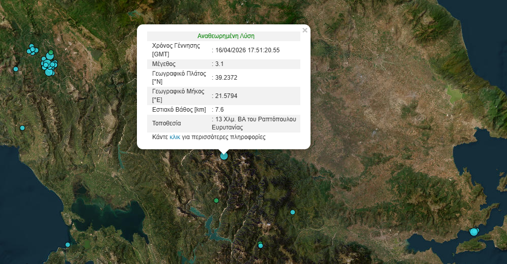 Σεισμός μεγέθους 3,1 Ρίχτερ σημειώθηκε το βράδυ της Πέμπτης 16/4 στην Καρδίτσα.