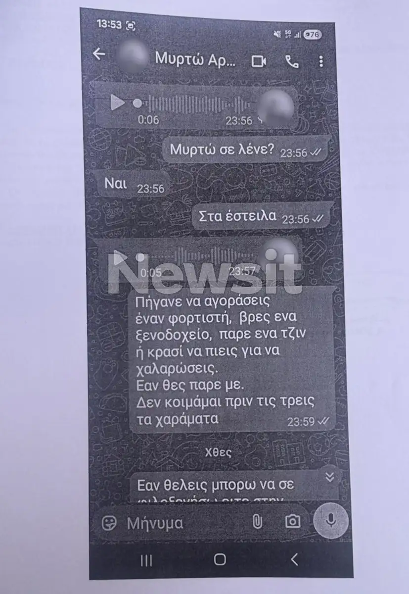 Τα τελευταία μηνύματα που αντάλλαξε η Μυρτώ μέσω διαδικτυακής εφαρμογής με έναν 66χρονο άνδρα, ενώ βρισκόταν στο ενοικιαζόμενο δωμάτιο στην Κεφαλονιά, όπου έχασε τις αισθήσεις της και εγκαταλείφθηκε λίγη ώρα αργότερα από τους τρεις κατηγορούμενους στην κεντρική πλατεία του Αργοστολίου, φέρνει στο φως της δημοσιότητας το newsit.gr.