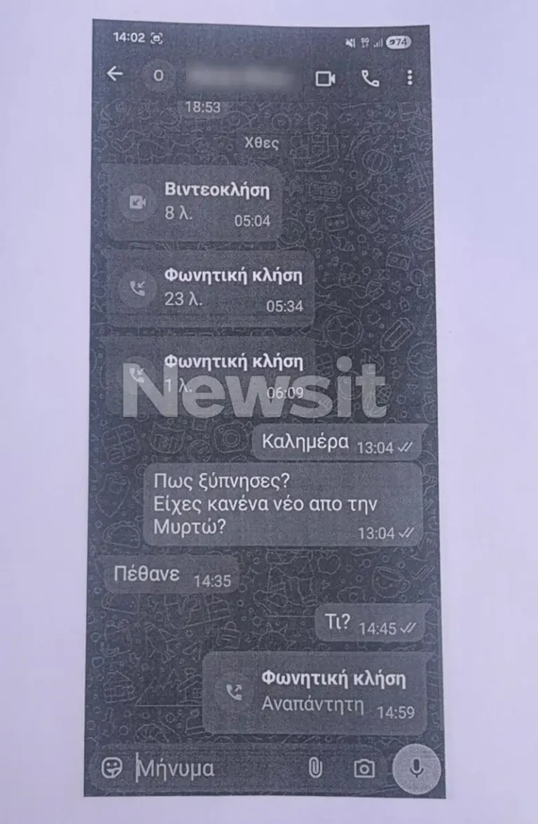 Όπως αποδεικνύεται από τα μηνύματα, η κοπέλα φαίνεται να ήταν ζωντανή έως τις 4 το πρωί της Τρίτης. Και αυτό γιατί στις 04:02 τα ξημερώματα της, η Μυρτώ επικοινώνησε με τον φίλο της μέσω βιντεοκλήσης.